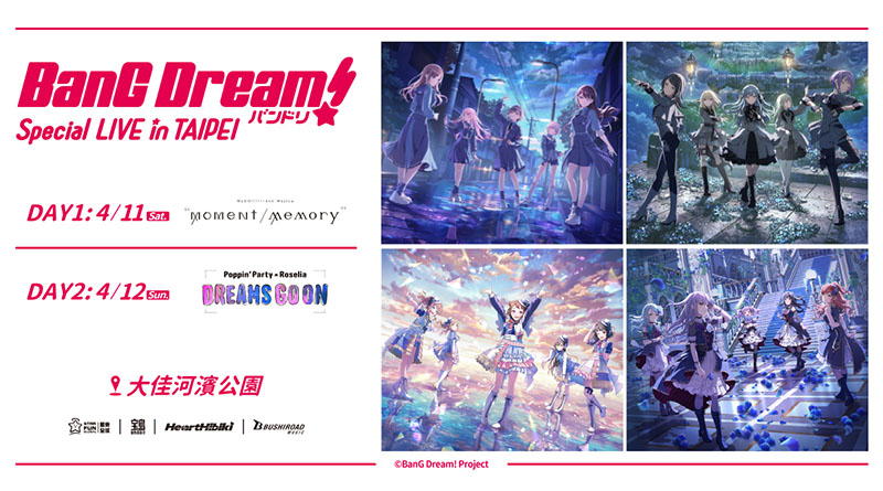 Bushiroad Music, Inc.宣布,BanG Dream! Project的首場海外戶外聯合演唱會「BanG Dream! Special LIVE in TAIPEI」將於2026年4月11日(週六)和12日(週日)在台北市大佳河濱公園舉行。